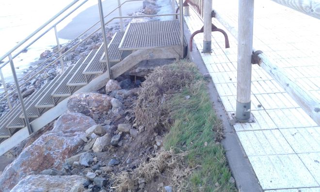 The storm this week has deteriorated the breakwater of the walk. In the photos attached it is possible to be seen how in a concrete point the great stones have moved downwards although this storm has not been of the strongest. From the association we express our concern about this disturbing situation and ask Costas del Estado to implement the final solution that they consider most appropriate.